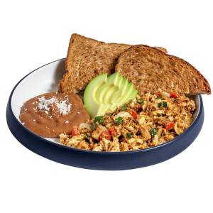 Huevos revueltos con machaca, tomate, cebolla y chile jalapeño, acompañado de aguacate, frijoles y pan tostado.